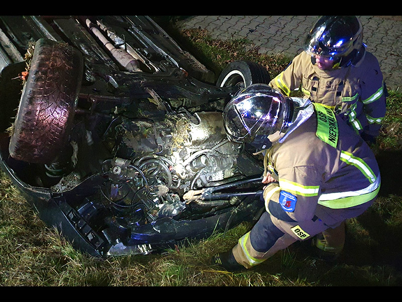 Gdy dojechaliśmy na miejsce, okazało się że w rowie, leży rozbity samochód osobowy. Samochód w trakcie wypadku dachował, a kierowca opuścił pojazd przed przybyciem służb. Na miejscu była już Policja. Odłączyliśmy akumulator i zakręciliśmy zawór na zbiorniku LPG. Na polecenie Dyżurnego Operacyjnego wróciliśmy do remizy.