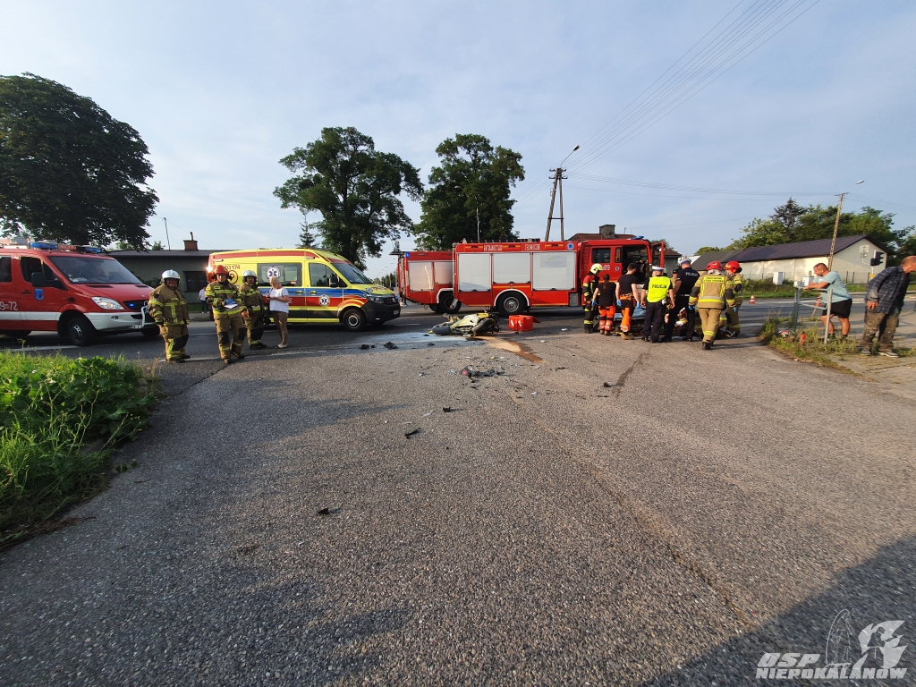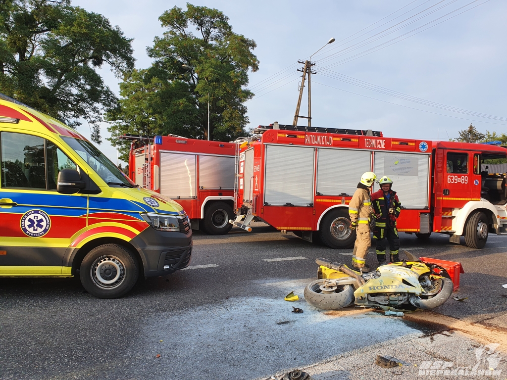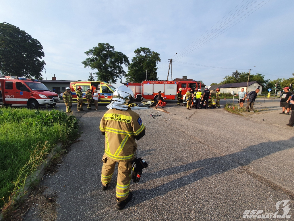 Po dojechaniu na miejsce, okazało się iż doszło do niebezpiecznego wypadku samochodu osobowego z motocyklem. Poszkodowani zostali opatrzeni a następnie przekazani zespołowi pogotowia ratunkowego. Pasażerka samochodu i motocyklista trafili do szpitala. W trakcie czynności został odłączony akumulator samochodu osobowego oraz zneutralizowano plamy oleju napędowego. Początkowo droga była zablokowana, ale po jakimś czasie wprowadzono ruch wahadłowy. Na koniec akcji uprzątnięta została i odblokowana całkowicie droga.